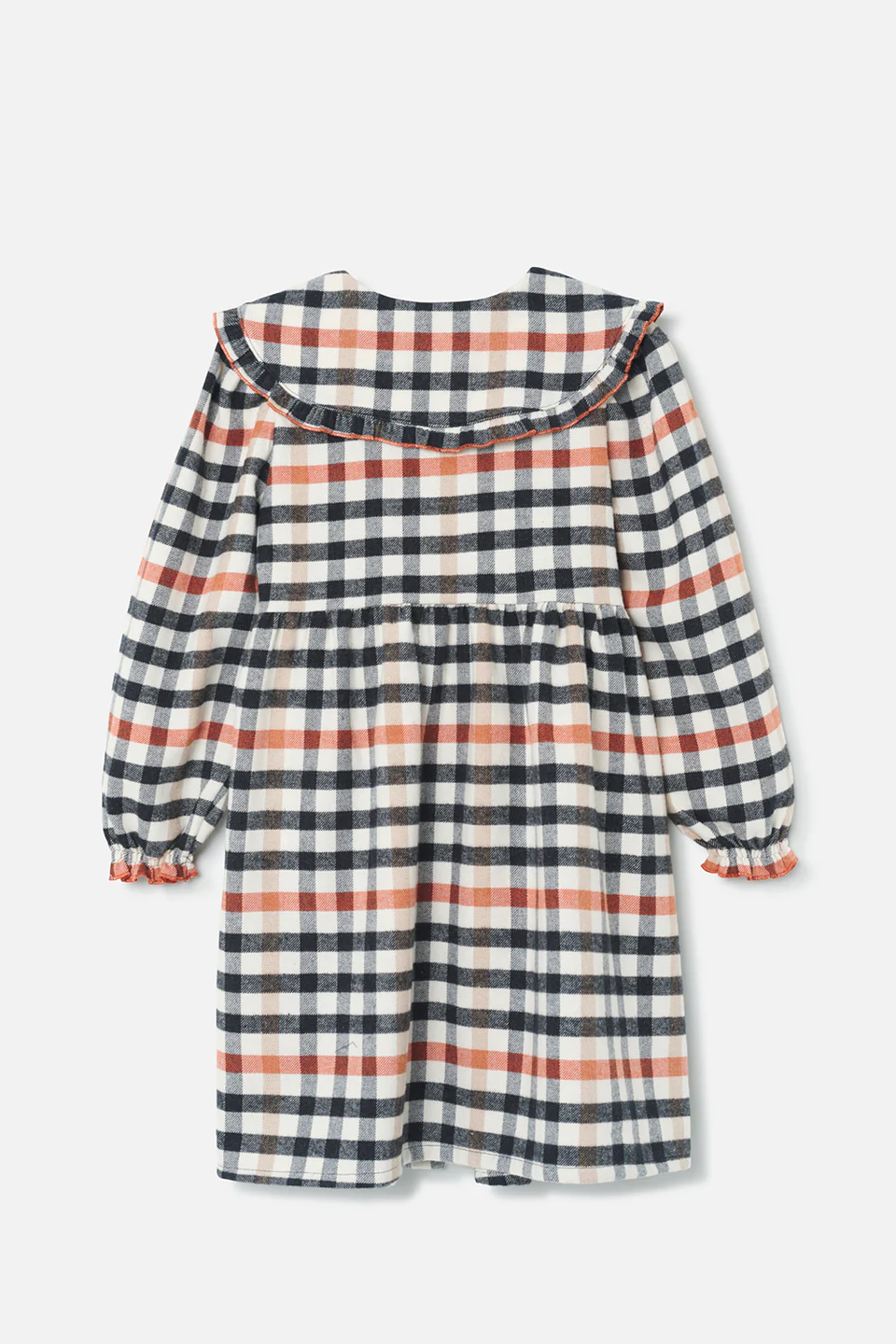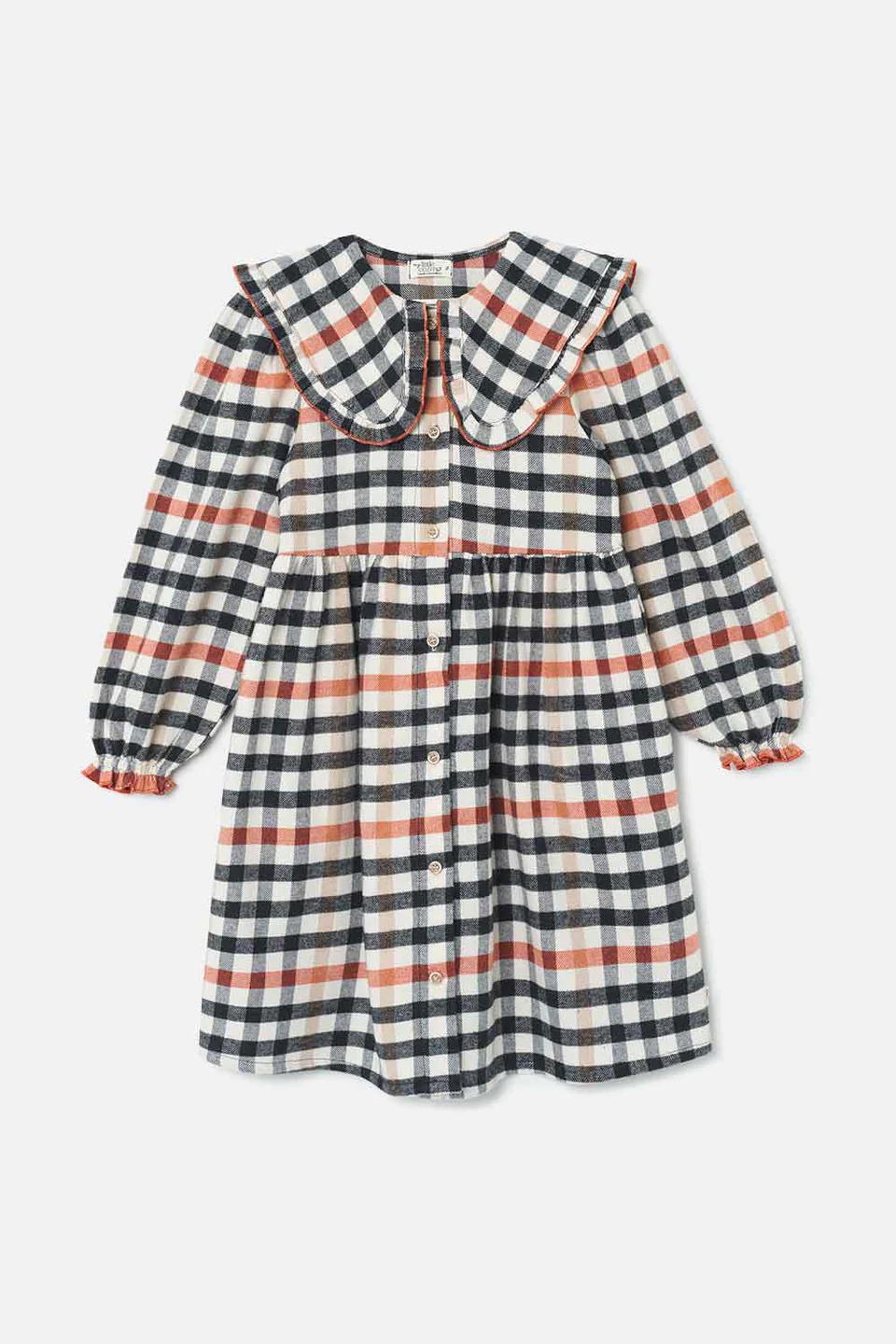 フリルで縁取られたピーターパン襟のチェック柄ドレス。フロントにボタン、ウエストにギャザー入り。袖口と裾はゴム入りのコントラストカラー。外側に起毛加工を施し、暖かさを演出。リサイクル・コットン60%、綿40%。布帛。